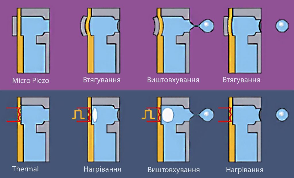 Усередині кожного сопла є п’єзокристал. Коли на нього подається електричний імпульс — він змінює форму, виштовхуючи краплю чорнил.